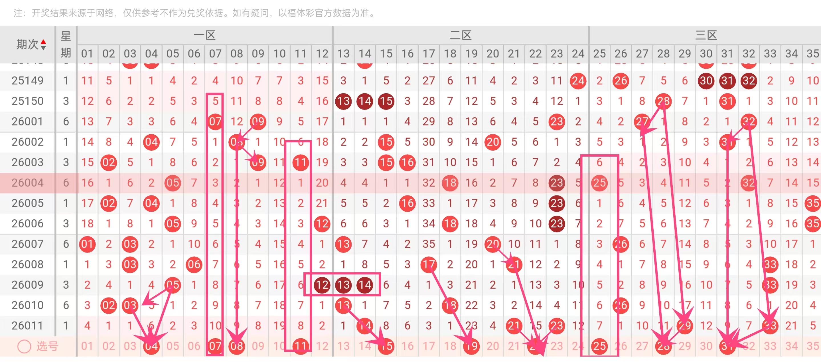 15在近5期中未出现,但历史数据显示其在13-18区间常作为衔接号出现,当前遗漏值适中,适合作为中段防守号。19在2026011期后未出,属于近期温号,且与21、23形成中后段号区支撑。22在2026011期前曾出现,近期遗漏2期,符合“隔期回补”趋势。25在历史开奖中常与23、29形成大号区间隔组合,当前遗漏合理,具备弹出条件。28在2026011期中与29相邻,常作为大号区过渡号出现,且近期大号区(28-35)除33外整体偏冷,有望回温。31在近5期未出现,但历史中与29、33常形成奇号组合,可作为大号奇号备选。