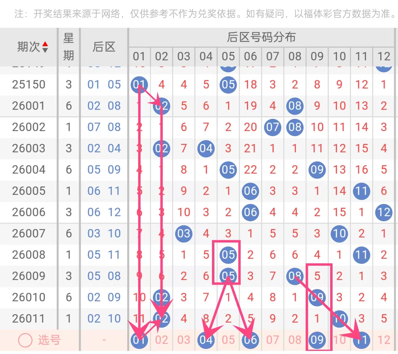 后区方面,近5期以02、05、08、09、10、11为主,小偶号占优。01虽近期未见,但历史中常与02、04形成小号组合,且当前遗漏较长,具备反弹可能。04在2026010期前后未出现,属于小偶号中的温冷号,与01、06可形成小号区间覆盖。06在近期后区中表现平稳,与09、11形成中段偶奇搭配。09在近2期连续出现,热度延续可能性高,且常与11形成奇号组合。11作为后区大号,近期出现频率稳定,可作为后区锚定号。