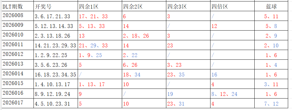 分享第一个数据分析:四分区统计数据。相对于传统的三分区,个人习惯使用四分区,就是把35个红球号码除以4,所得的余数分区如下: