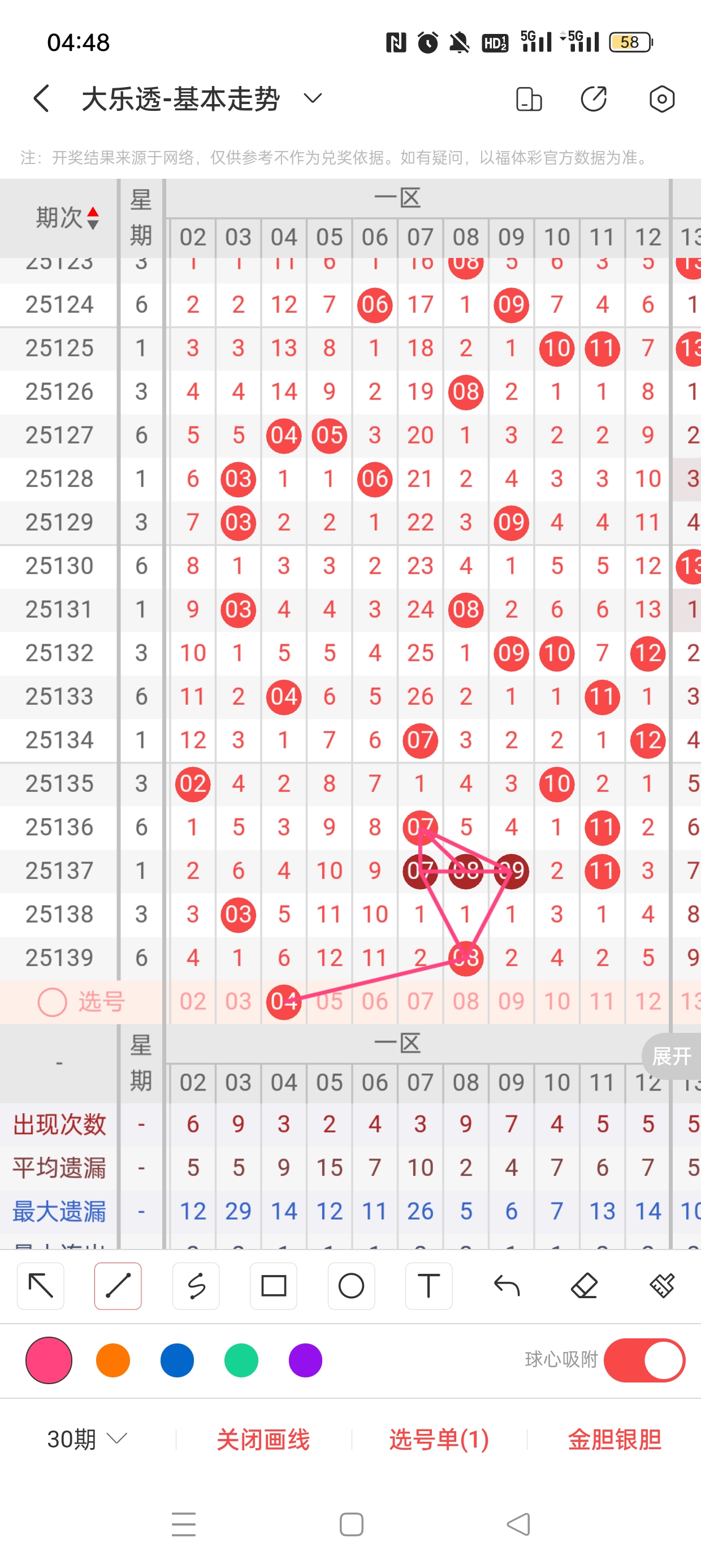 一区(1-12)近128期本区邻孤传56邻102孤7传,孤号热度高,本期着重邻传。近128期本区012路48:54:62,2路热度高,本期着重0/1路。4已遗漏6期,与8之间呈现向左遗漏递减态势,需防。
