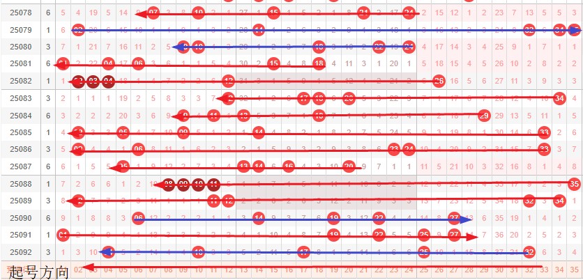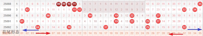 如图所示:首尾制约平衡组范围依次为:推推缩,拉推? 本期形态范围优先选择红色压缩首尾。由于上期号码处在4连号的分割已经分割完成,是利用小跨形成连号形态,还是无连号继续交换首尾走势为本期正反方向,主力形成红色压缩首尾。