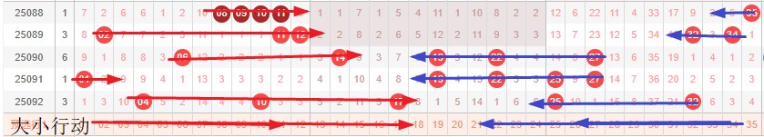 如图所示:体现的是3个局部走势的发展周期,圆圈为密集处的填空,本期定性为新局部走势5期,主力填空第3期,架构填空第2期。蛋跨定性为10-20,真实空间布局在1-6。本期蛋跨预估3枚左右,即优选小号多开在1-2区出号。关键在于空间4-10和10-17要造成反向推,而上期号码为交换首尾,本期不交换首尾即开压缩和推进首尾,交换则拉伸大跨,前者有连,后者无连,本期优先考虑压缩首尾。