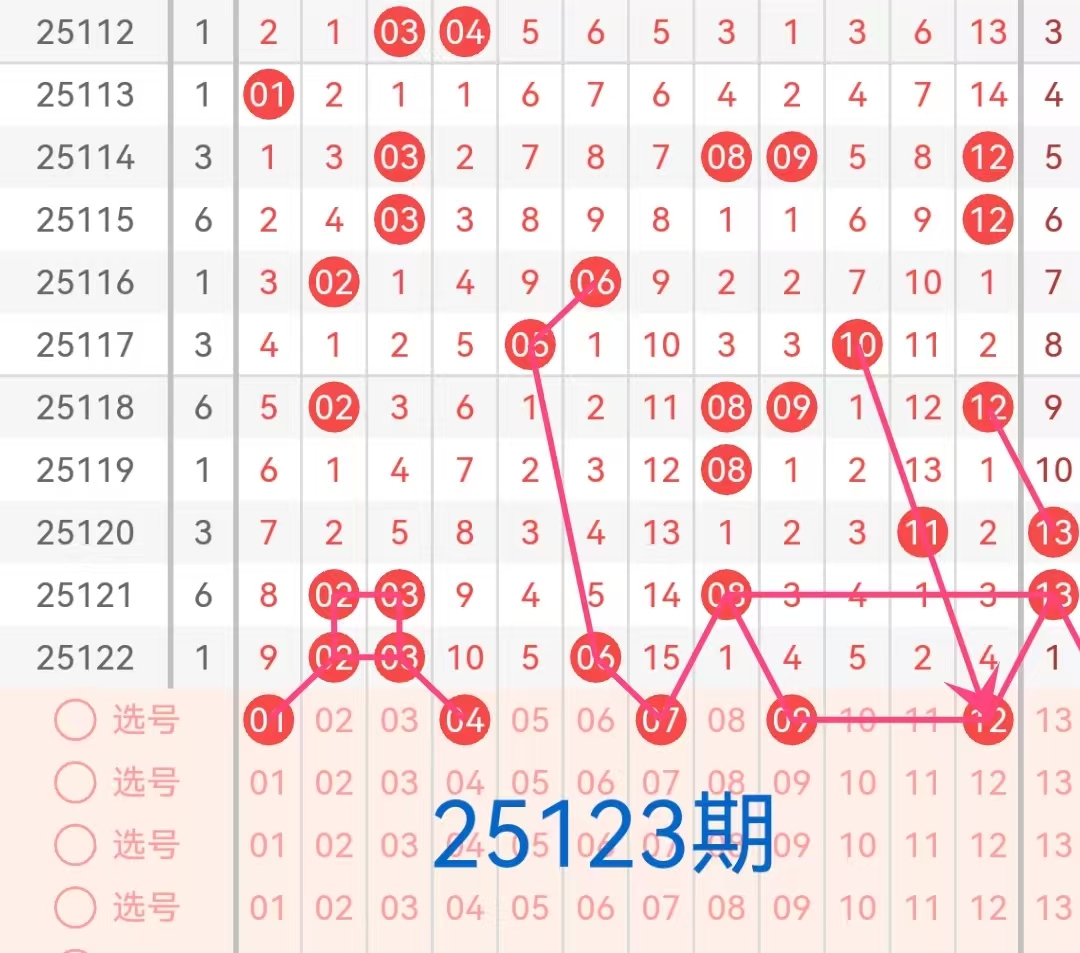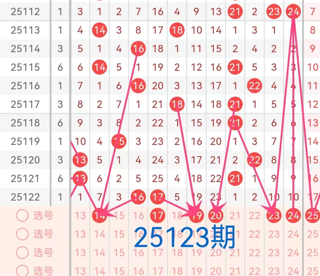 2. 二区(13-24):上期该区间开出两个号码16和17,号码16遗漏5期后开出,号码17为该期的凤尾号码,在遗漏25期后开出,且与前期开出的号码16形成一组二连号的形式。根据历史开奖来看,近期该区间活跃度较低,本期预计会有1-2个号码会继续开出。特别是那些遗漏次数较大的号码和该区间内近期表现较好的号码,如14、17、19、20、23、24这几个号码在走势上表现出一定的稳定性,且与前几期出号形成呼应,有望出现在本期开奖中。