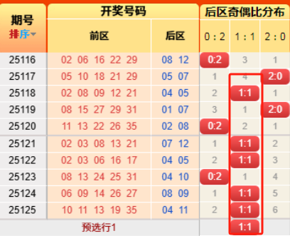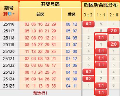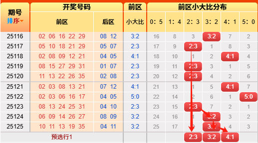 上期前区小大比3:2,命中啦,近期统计54期中48期。言归正传我们继续用历史数据说话,前区小大比分成6种0:5、1:4、2:3、3:2、4:1、5:0(如图),我统计了一下历史出现次数,0:5出现106次、1:4出现513次、2:3出现966次、3:2出现805次、4:1出现350次,5:0出现53次,再看近10期小大比出现次数比为0:0:4:3:2:1,通过历史数据对比观察以及根据遗漏对称理论原则,故本期我们选择2:3、3:2、4:1;(具体精准方向请查看小车小大比精选)