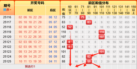 上期开出和值82,又又命中和值范围。本次我们先根据历史次数统计,和值60以下开出246次、61-70开出234次、71-80开出367次,81-90开出480次、91-100开出491次,101-110开出380次、111-120开出312次、121-130开出155次、131-140开出90次、141-150开出26次、150以上开出9次,再来看近十次以上和值分别开出了3次、0次、1次、3次、0次、3次、0次、0次、0次、0次、0次 ,低于阈值的有60区间以下、61-70区间、81-90区间、91-100区间、101-110区间、121-130区间,再根据遗漏斜率对称理论,本期注意60以下、61-70区间、71-80区间、111-120区间。