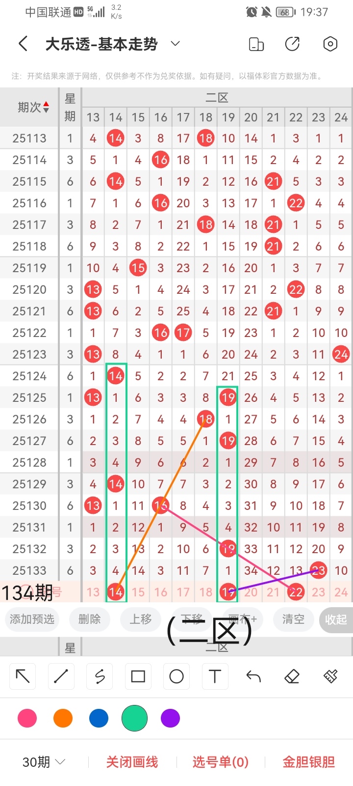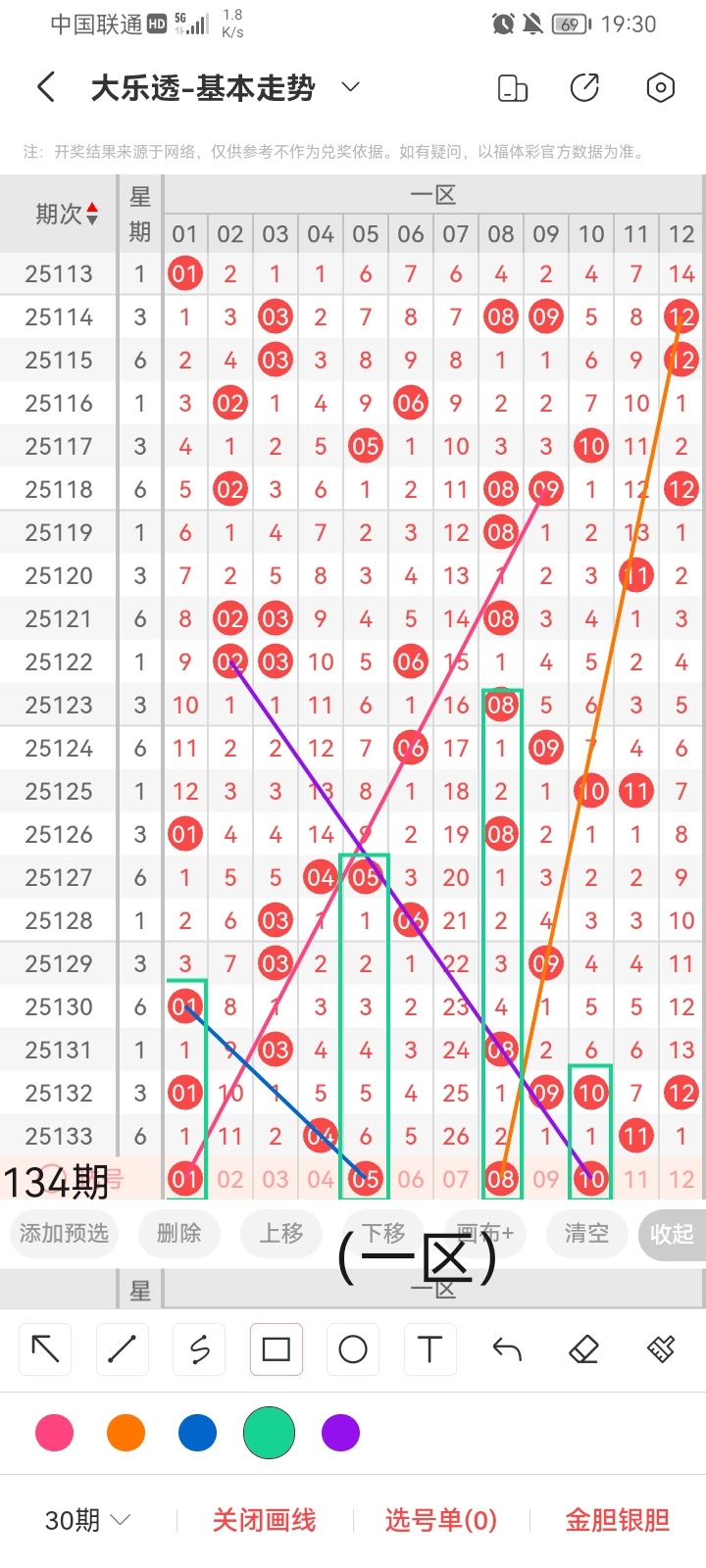 通过以上对上期的简单回顾,下面进入大乐透第2025134期(下面简称本期)的选号分析:
