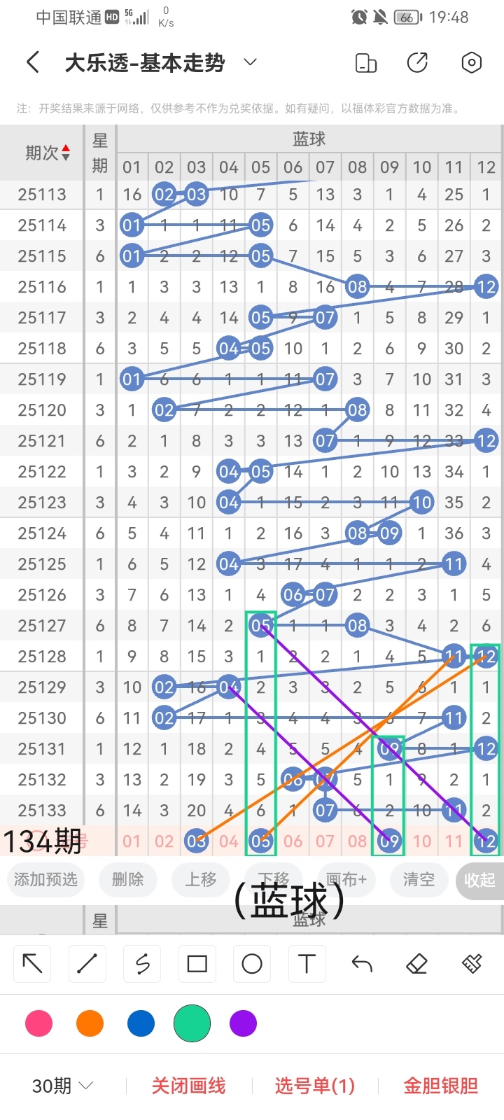小梁根据图中画线思路,最后给大家汇总提供一下大乐透本期红球、蓝球数据,供大家参考: