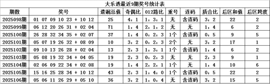 体彩大乐透第2025106期奖号为:05 06 11 26 29 + 05 10,各位号码遗漏期数分别为:2期、1期、9期、3期、21+2期、0期,前区号码遗漏总期数为36期,012路比为104,奇偶比为32,没有开出重复号码。后区号码遗漏总期数为2期,和值为15,跨度为5