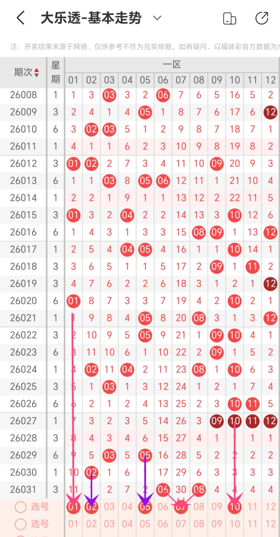 通过对同期次重号出现的数量规律进行统计分析,本期考虑出号0-1个,即12-22-25-27-28出号0-1个