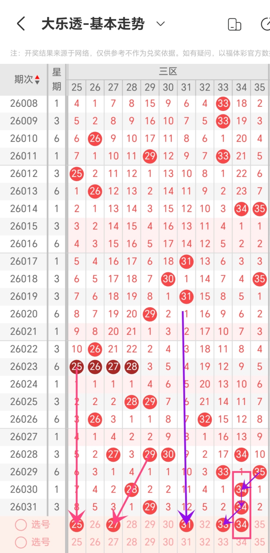 通过对同星期周六重号出现数量规律进行统计分析,本期考虑出号0-2个,即03-05-17-33-35出号0-2个