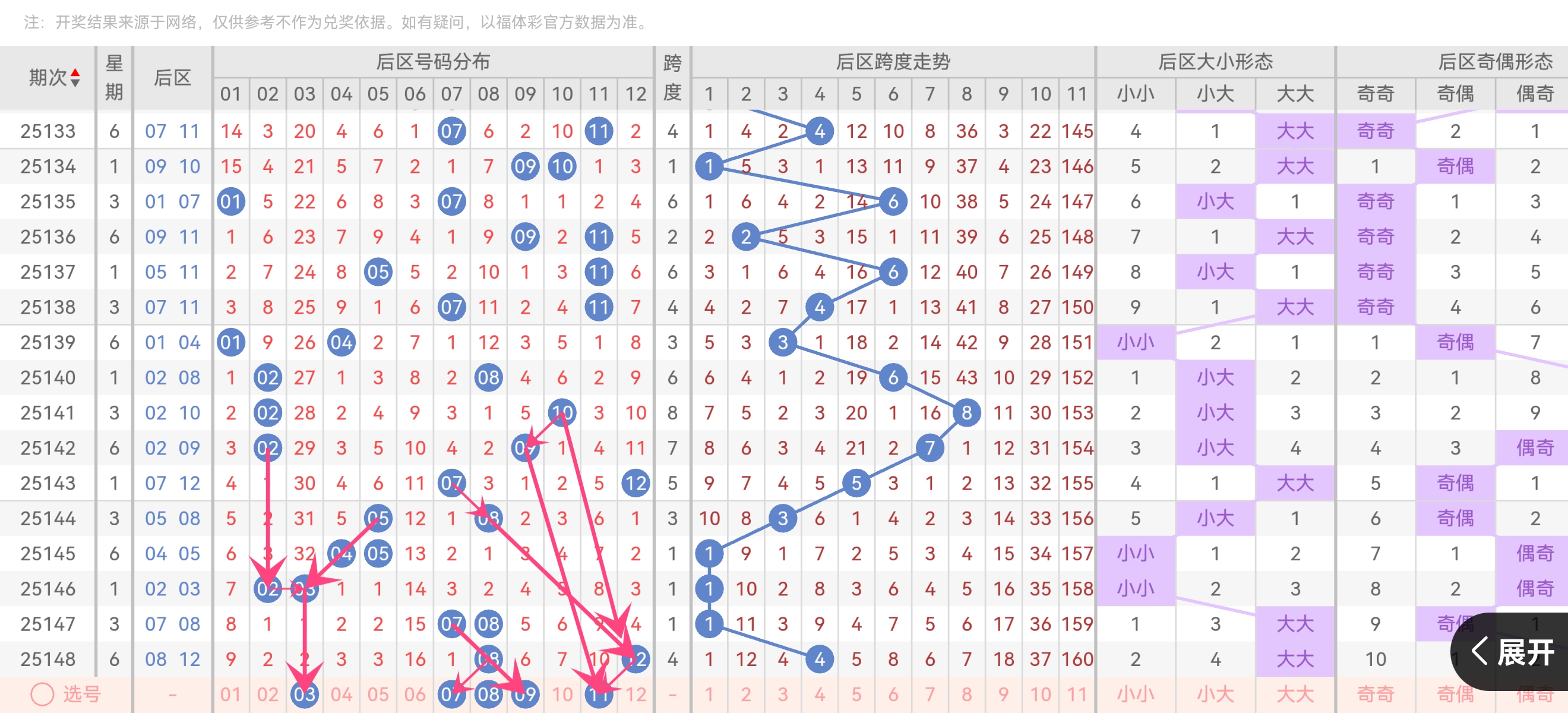 和值趋势近10期后区和值在5-19之间波动,上期为20(08+12)。