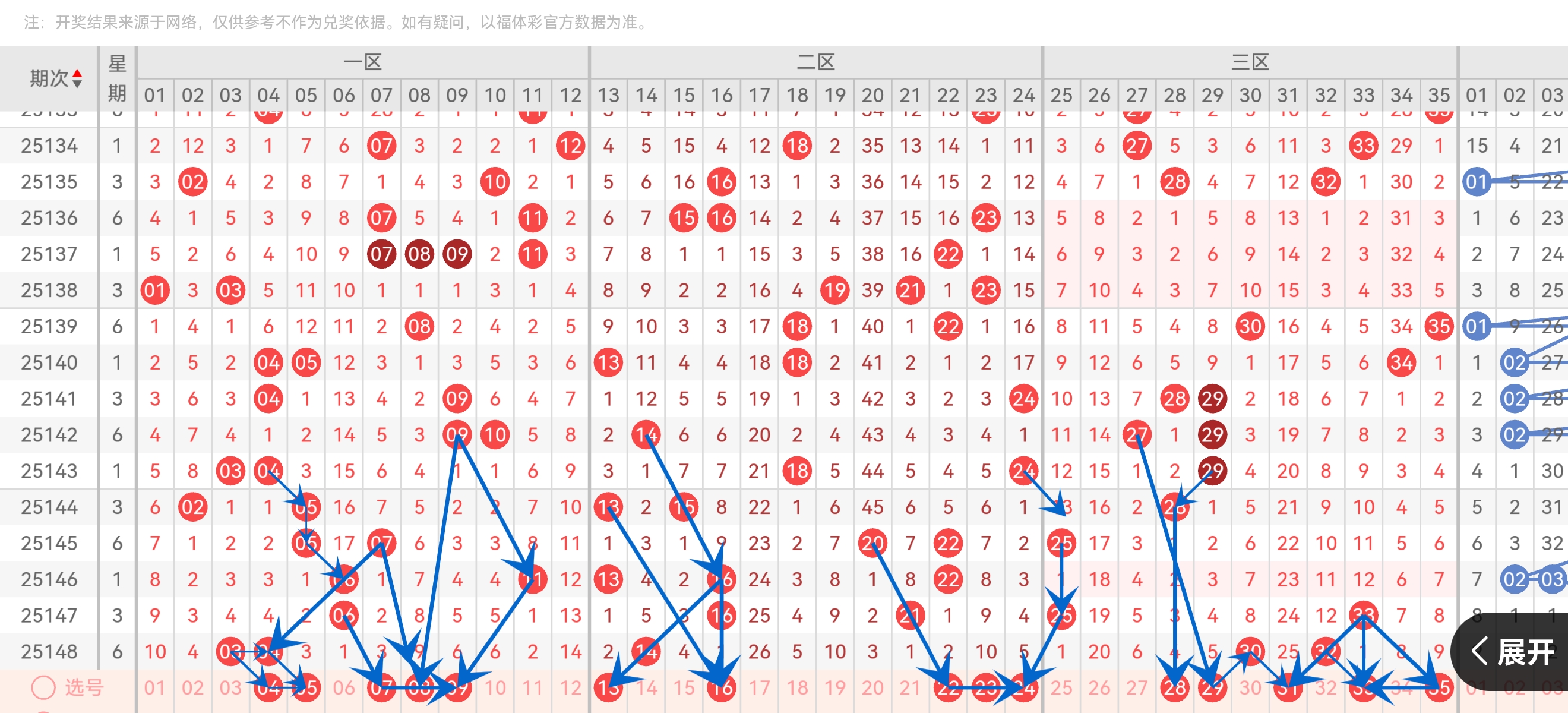 近10期出现连号的期数:25140期(04-05)、25141期(28-29)、25144期(13-15)、25145期(05-07)。本期连号建议:关注 1路号码连号(如13-16、22-25)或 2路号码连号(如05-08、29-32)。重点组合:07-08(1路+2路)、28-29(1路+2路)。重号规律