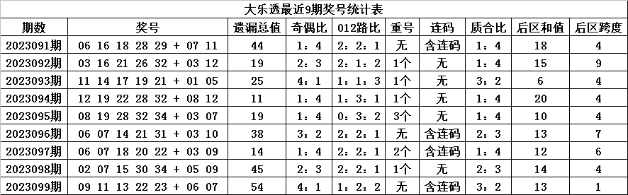 体彩大乐透第2023099期奖号为:09 11 13 22 23 + 06 07,各位号码遗漏期数分别为:16期、5期、15期、1期、17期+21期、3期,前区号码遗漏总期数为54期,012路比为1:2:2,奇偶比为4:1,没有开出重复号码。后区号码遗漏总期数为24期,和值为13,跨度为1。