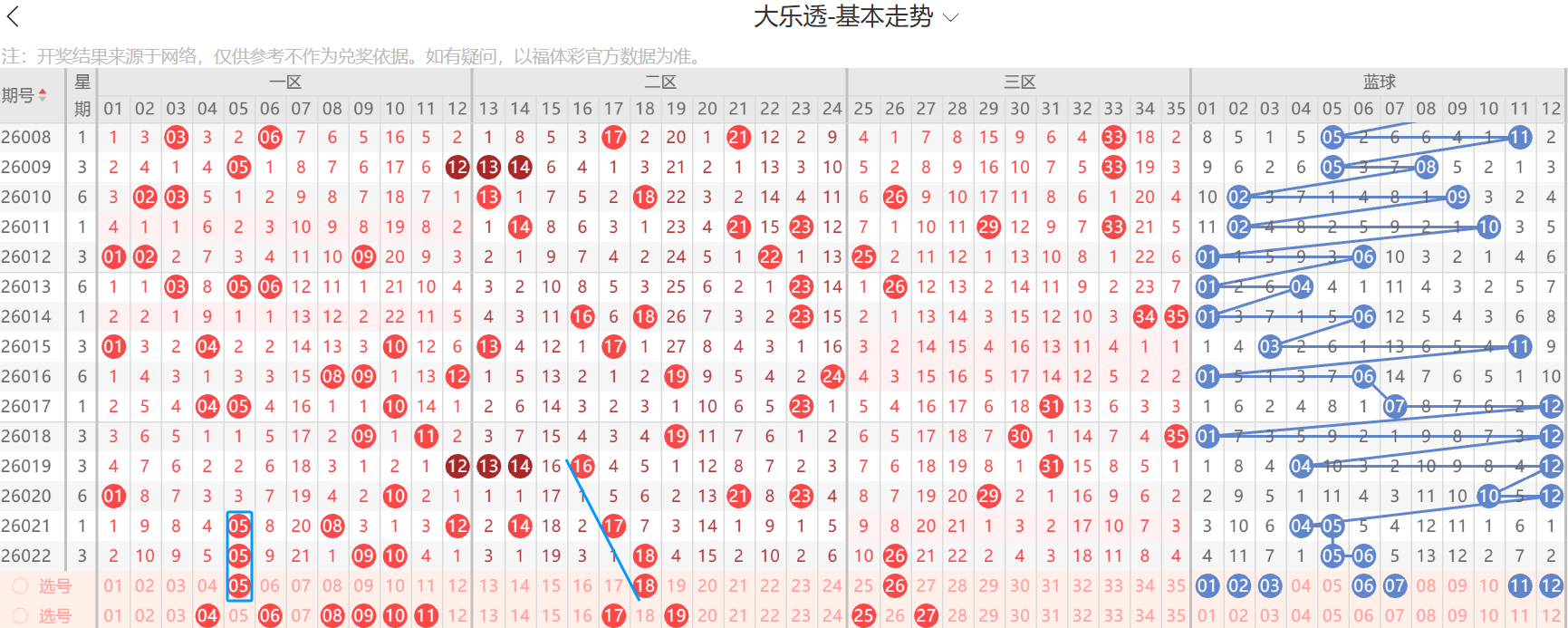 本期的重号会比较极端,要么出两个要么一个没有,各占百分之50,不能确定的就两种思路吧,关注5.18.26开出,边号两个左右,防没有边号,蓝球上期竟然落空了,惭愧,连续两期连号出蓝,小心这种形态继续开出,本期大底1.2.3.6.7.11.12.