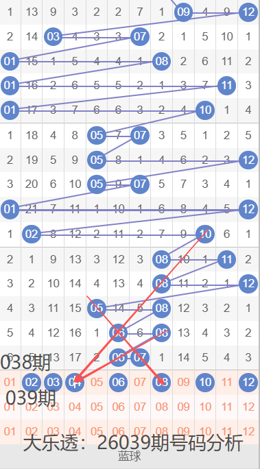 通过上期号码的简单分析,我们看下26039期红色号码球的总体走势,如下图: