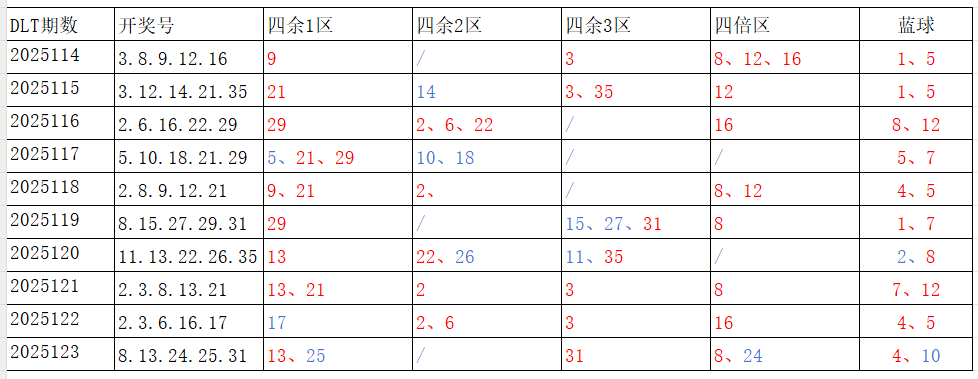 分享第一个数据分析:四分区统计数据。相对于传统的三分区,个人习惯使用四分区,就是把35个红球号码除以4,所得的余数分区如下: