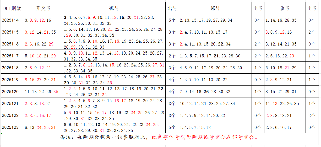如图,以近两期数据为一组,进行对比分析,相同的孤号、邻号可能在下期开出。本期参考孤号:1.2.3.4.5.6.10.11.15.16.17.18.19.20.21.22.27.28.29.32.34.35;邻号:7.9.12.14.23.26.30.33。重点关注:孤邻号重合号码:***(会员专区可见)。个人分析,仅供参考。
