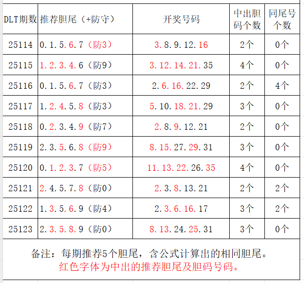 如图,每期推荐胆尾中出1-4个。上期推荐胆尾中出3尾3码!推荐胆尾是按照公式计算的顺序,不定位红球号码的顺序。本期推荐胆尾:2尾/9尾/0尾/7尾/3尾,加推防守胆尾+胆码号码:***(会员专区可见)。个人分析,仅供参考。