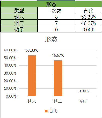 上期开的是组六,各个类型占比没有变化。通过图示可以看到,组六在15期内开了8期,组三开了7期。本期关注组六,防组三。