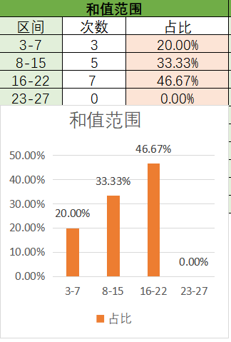 上期和值是7,处在3~7之间,其中3~7占比变大,8~15占比变小。目前是16~22占比最优,其次是8~15,最后是3~7。本期看好和值在8~15之间,其次是16~22。
