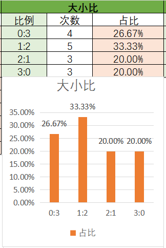上期大小比为0:3,其中0:3占比变大,2:1占比变小。可以看到近15期内1:2优势最好的,其次是0:3,最后是3:0,2:1。本期看好2:1开出,其次是1:2。
