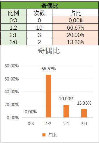 上期奇偶比为1:2,各个类型占比没有变化。近15期内1:2优势最大,然后是2:1,最后是3:0。上期开了1:2奇偶比,本期看好2:1奇偶比的开出,其次是1:2。
