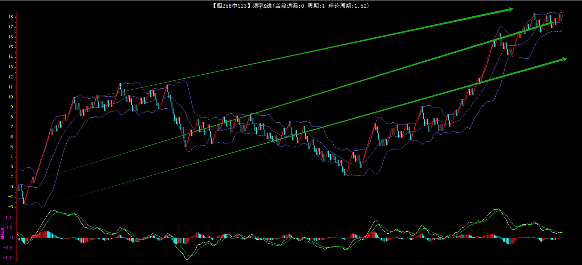 整体趋势上行,上边沿线趋势向上,下边沿趋势也是向上,节点震荡,当前连开2期,本期关注。