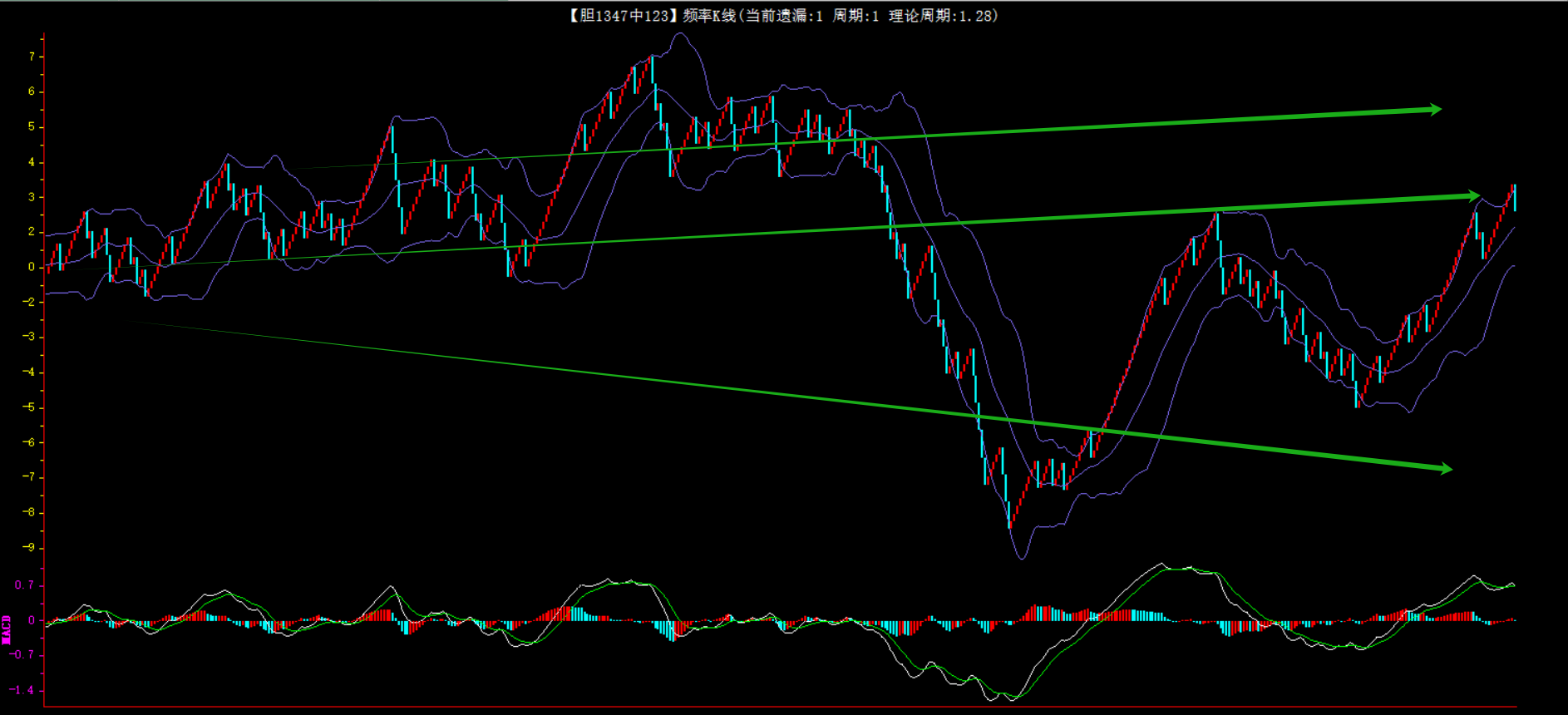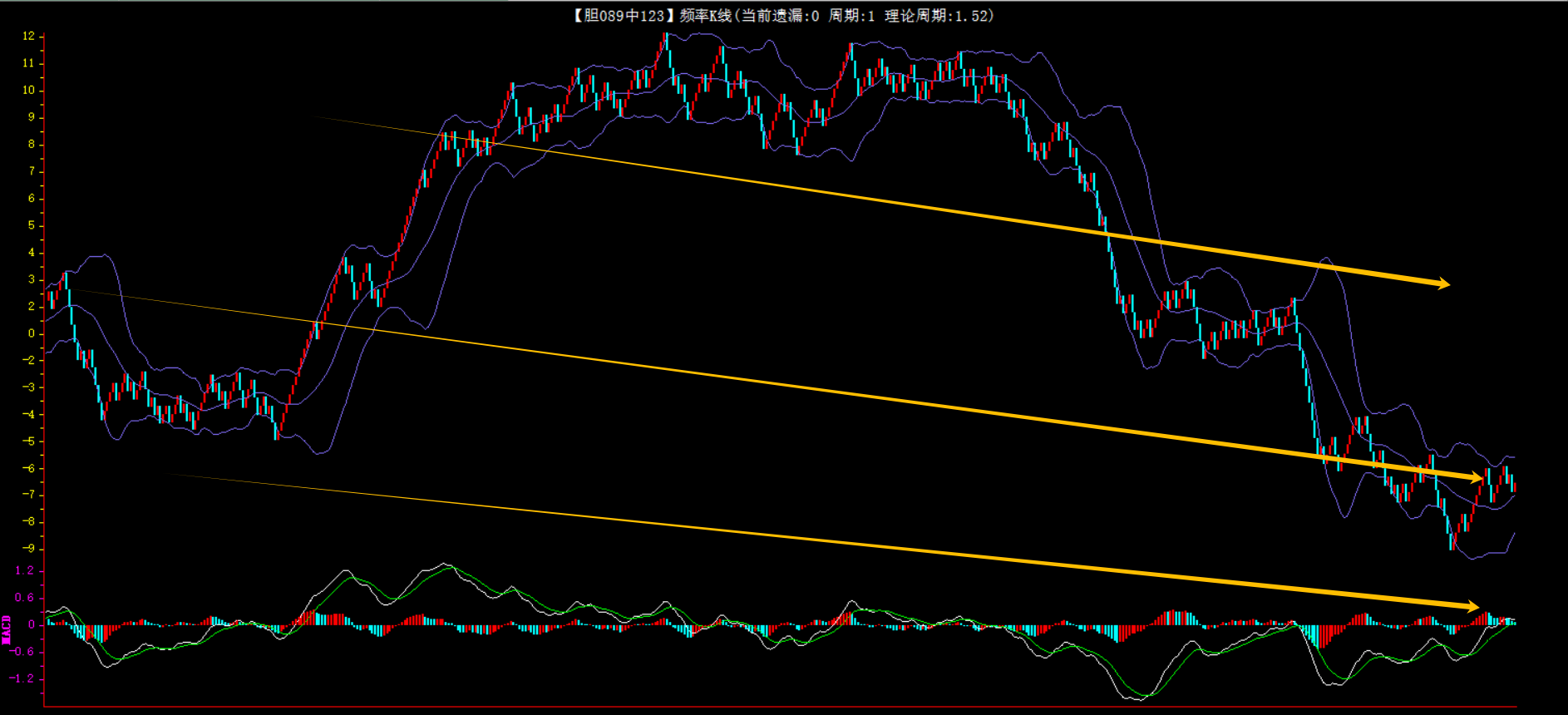 整体趋势下行,上边沿线趋势向下,下边沿趋势也是向下,节点震荡,当前开1期,本期防守。