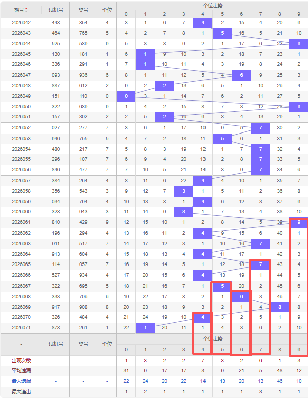 上期个位:1,近10期个位出号:4 7 4 7 4 5 6 8 4 1。最近10期大小变化分别:小大小大小大大大小小,奇偶变化分别:偶奇偶奇偶奇偶偶偶奇,质合变化分别:合质合质合质合合合质,根据近10期规律本期综上所述个位出号推荐5个号码:4 5 6 7 9。
