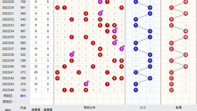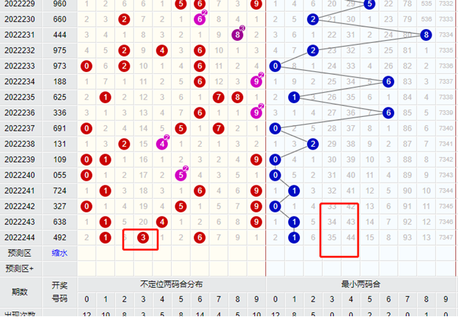 我们可以看到上图243和244期开出的号码全是1路和2路的结合体,所以245期必须要关注0路号码的开出,所以245期应该关注胆码0369,当然从这4个胆码去选择2个,最佳的号码组合就是3和6了,这点很重要。