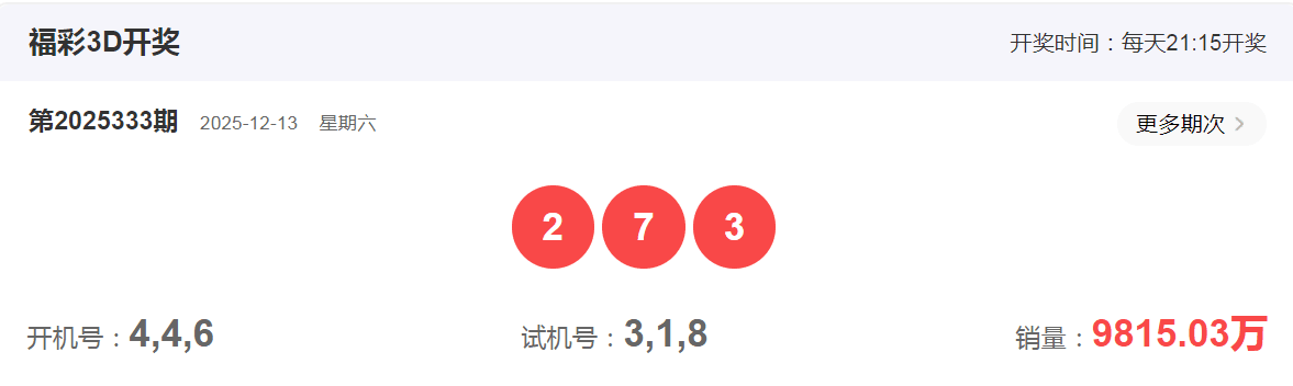 福彩3D2025年12月13日第333期开奖号码是273,跨度5,和值12,大小大,组六形态,偶奇奇