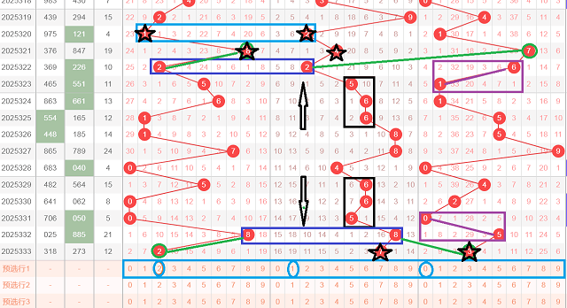这是一幅利用十位来分析全局的走势图,一个是往上分析,一个是往下分析,坐标都是黑颜色框665,第一次坐标往上上期开出了226,组三形态,百位和十位都是对子,百位和十位都是2路号码,在第二次坐标的往下下期开出了885,也是组三形态,百位和十位都是对子,百位和十位也是2路号码,第一次蓝颜色是两个2,2的对应数是7,2的补数是8,然后往上就开出了7和8的两码组合,在第二次蓝颜色两个8,8的对应数是3,8的补数是2,然后在下一期就开出了2和3的两码组合,第一次黑颜色星星8和4相加等于12,在上期就开出了12的两码组合,那么轮到今天273,273只有7和3才能相加等于两个数,只有7加3了,7加3等于10,推荐今天两码组合10,文字表达可能不太清楚,不太清晰,大家可以观看上面的走势分析视频