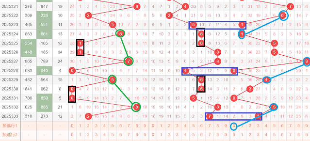 这是一张利用十位来分析全局的走势分析图,黑颜色都是坐标,蓝颜色都是两码差4,绿颜色都是两个数字相加等于13,青颜色都是两个数字相减等于5,这张走势分析图不太好用文字表达,大家可以观看上面的视频