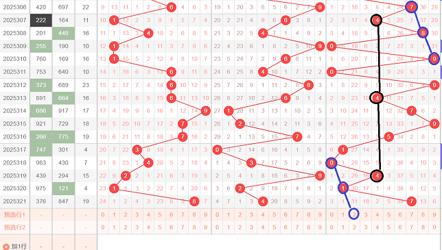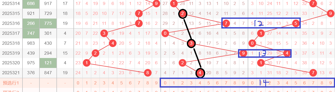 这是一张十位走势图,在十位出现了黑颜色2,间隔两期出现了黑颜色3,再间隔两期又出现了黑颜色4,形成了一个234全小的等距,我们发现黑颜色2的下期十位和个位出现了蓝颜色7和5,7和5相差等于2,或者是7和5相加等于12,总之是和这个黑颜色2有点关系,同样的道理,在黑颜色3的下期十位和个位出现了蓝颜色9和4,9和4相加等于13,也就是说蓝颜色9和4和黑颜色3有点关系,那么轮到今天的黑颜色4,在下期十位和个位相加等于4或者相加等于14,文字表达可能不太清楚,大家可以观看上面的视频