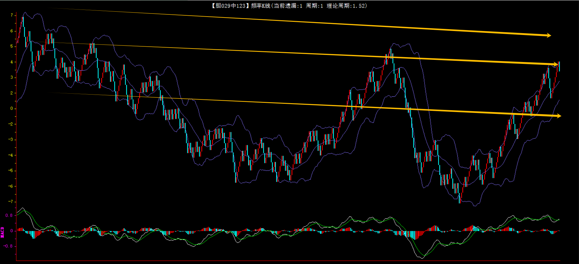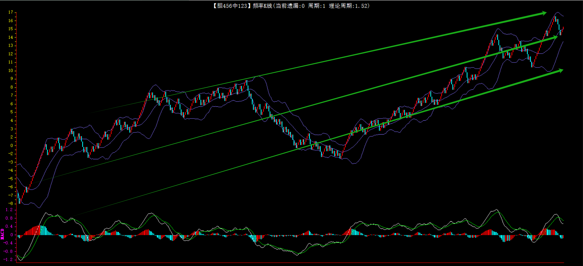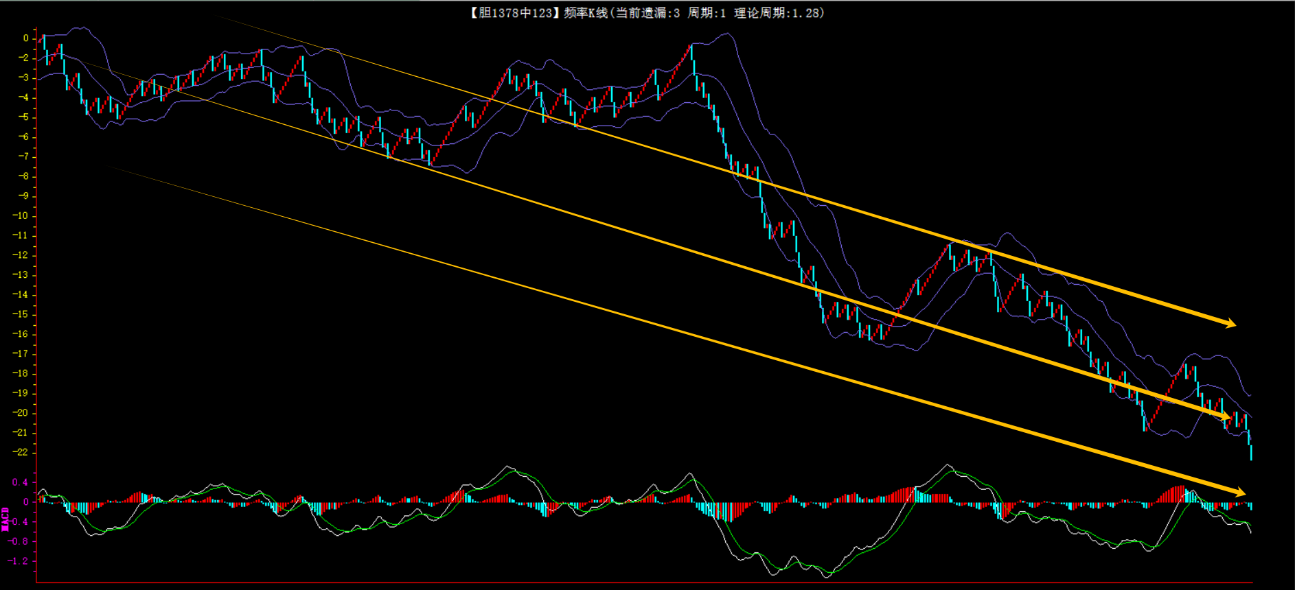 整体趋势下行,上边沿线趋势向下,下边沿趋势也是向下,节点震荡,当前遗漏1期,本期防守。