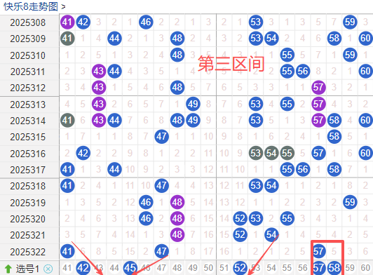 三区间开出了3个奖号(41.47.57)上期回顾三区开出3个奖号上期的三区间的奖号数量呈现一个不变的形态,4头回补2个,本期先来看号码42近期出现频率相对来说还是很稳定。偶尔有时间隔期数也是很长,说明其在近期的开奖中较温热的,号码45在近 30 期内出现次数相对还不是稳定的号码,近期的活跃度也是较冷。号码52有一定的间歇性,通常间隔5-3期会出现一次,没有明显的连续出现态势,走势相对较一般,在整个第三区间的表现本期还是可以防守的。号码57走势相对近期较热,近期没有连续间隔落号的情况,活跃度近期处于较稳定状态注意防守。