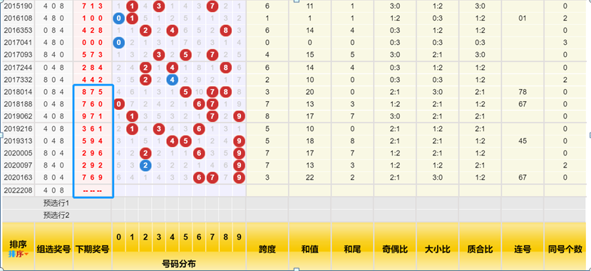 上图是近几年开出组选408之后,下一期的中出号码情况我们先挑出近9次开出408组选之后开出号码的情况,通过上图可以看见,近4次开出408之后,下期开奖号码里数字9非常热连续开出了4期,因此热号必须要保留,那么可以考虑9来作为胆码非常不错,这是408开出之后给我们的第一个概念。