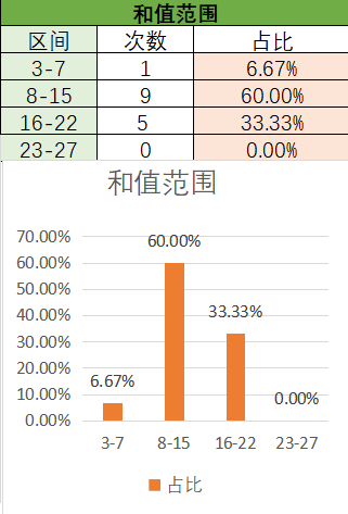 上期和值是12,处在8~15之间,其中8~15占比变大,23~27占比变小。目前是8~15占比最优,其次是16~22,最后是3~7。本期看好和值在8~15之间,其次是16~22。