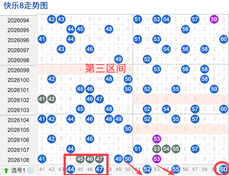 三区间开出了7个奖号(41.45.46.47.49.50.53)上期回顾三区开出7个奖号上期的三区间的奖号数量呈现一个递增的形态,4头回补5个5头回补2个号,本期先来看号码44期出现频率相对来说是很稳定。时间隔期数也是很稳定在近期的开奖中较温热注意防守,号码47在近 30 期内出现次数相对是较冷的号码,近期的活跃度也是较。号码52有一定的间歇性,通常间隔5-10期会出现一次,有明显的连续出现态势,走势相对还是不很稳定,在整个第三区间的表现较温热本期还是可以防守的。号码55走势相对近期较一般,近期有连续间隔落号的情况,活跃度近期处于温冷定状态注意防守。