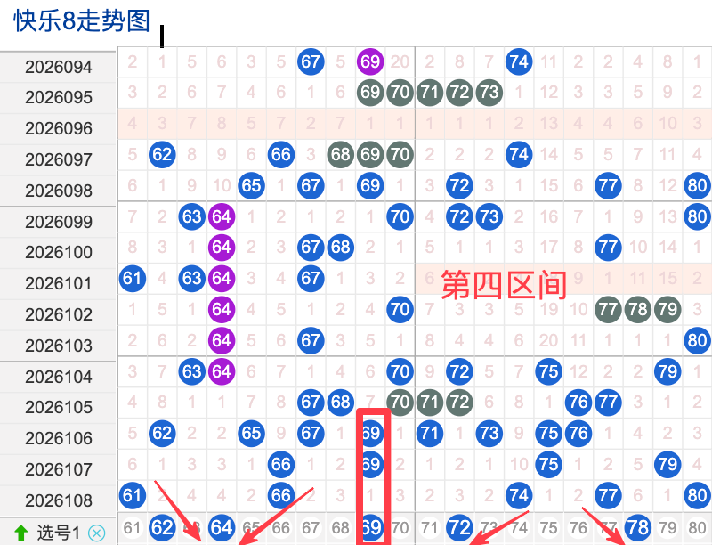上期四区间开出了5个奖号(61.66.74.77.80)上期的四区开5个奖号呈现了一个递增趋势,开出的奖号6回补2码7回补2个,先来看号码64在近 30 期内属于不是稳定的号码,近期出现频率相对温热,偶尔会间隔多期后出现一次,这个号码要注意防守,号码72具有一定的间歇性近期活跃度是很稳定比如有时会间隔38期就再次出现,有时会间隔多期,近期整体出现频率比较温热,近期还是要关注的.号码78活跃度近期比较,有一定的间歇性,整体走势有一定的波动性.
