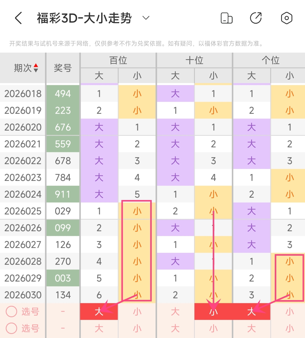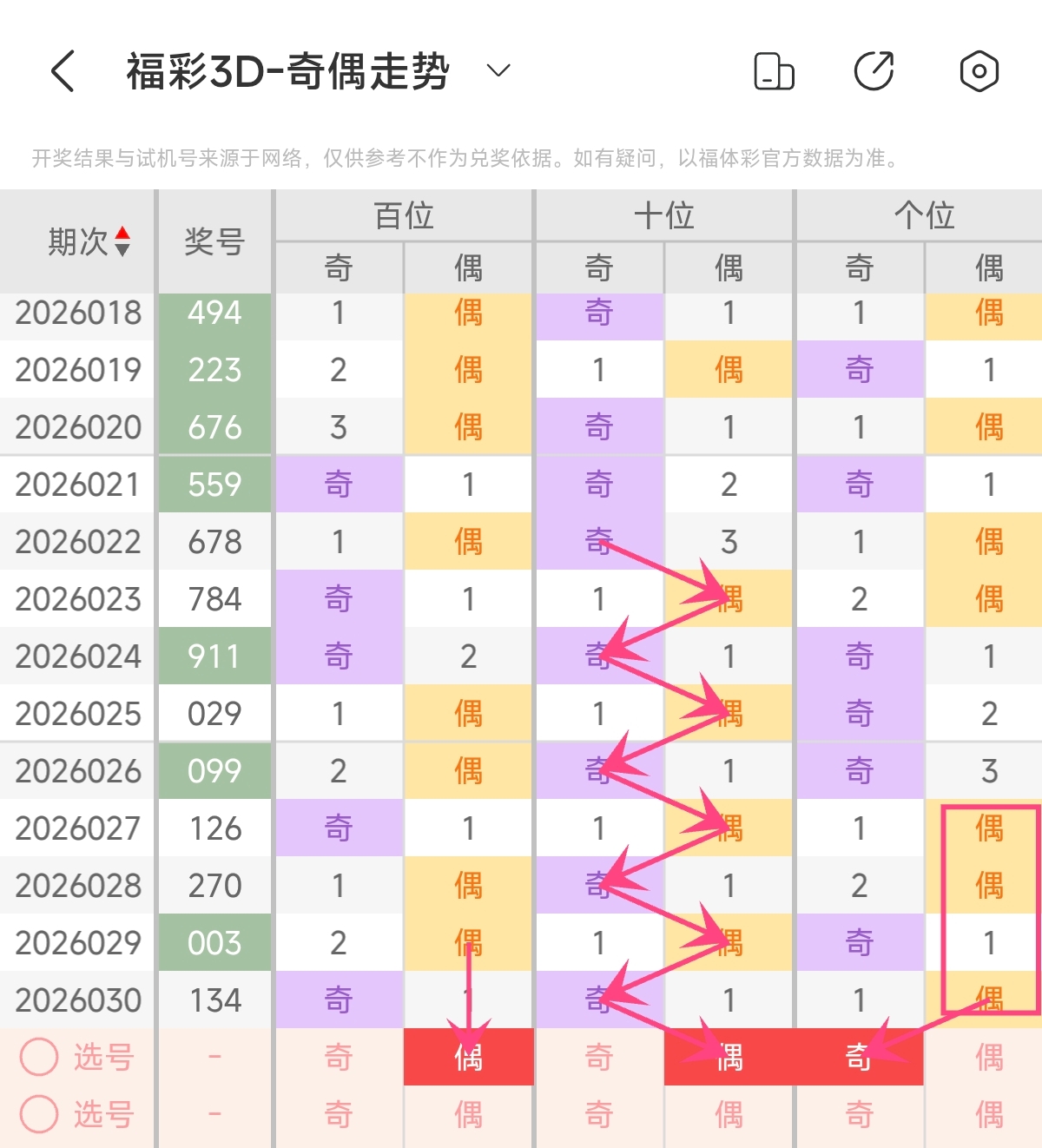 首先让我们回顾一下上期福彩3D第2026030期开奖号码为134 ,为组六形态,大小比为0:3,奇偶比为2:1,跨度为3,和值为8。