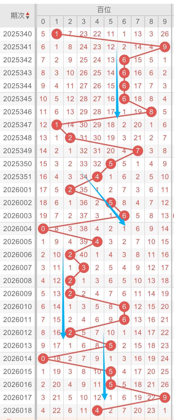 以近30期百位的走势形态分析:重复形态交替出现。例如:数字2/5/86重复开出。本期重点关注:数字5/6可能重开,同时关注数字4-5/6开出斜连形态。个人分析,仅供参考。