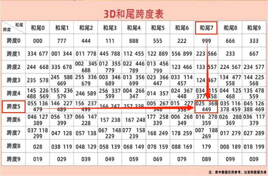 最后分享一个实用的3D和尾值与跨度值组合统计表。组合号码时,根据推测的和尾值结合跨度值,查找统计表上推荐的组合号码。以26018期为例:和值尾7、跨度值5,在统计表上查找的组合号码有:025/368/449,其中组合号码中出449(开奖号码494)。特别注意:统计表上推荐的组合号码,不是直选号码,不定位百十个位的顺序。仅供参考。