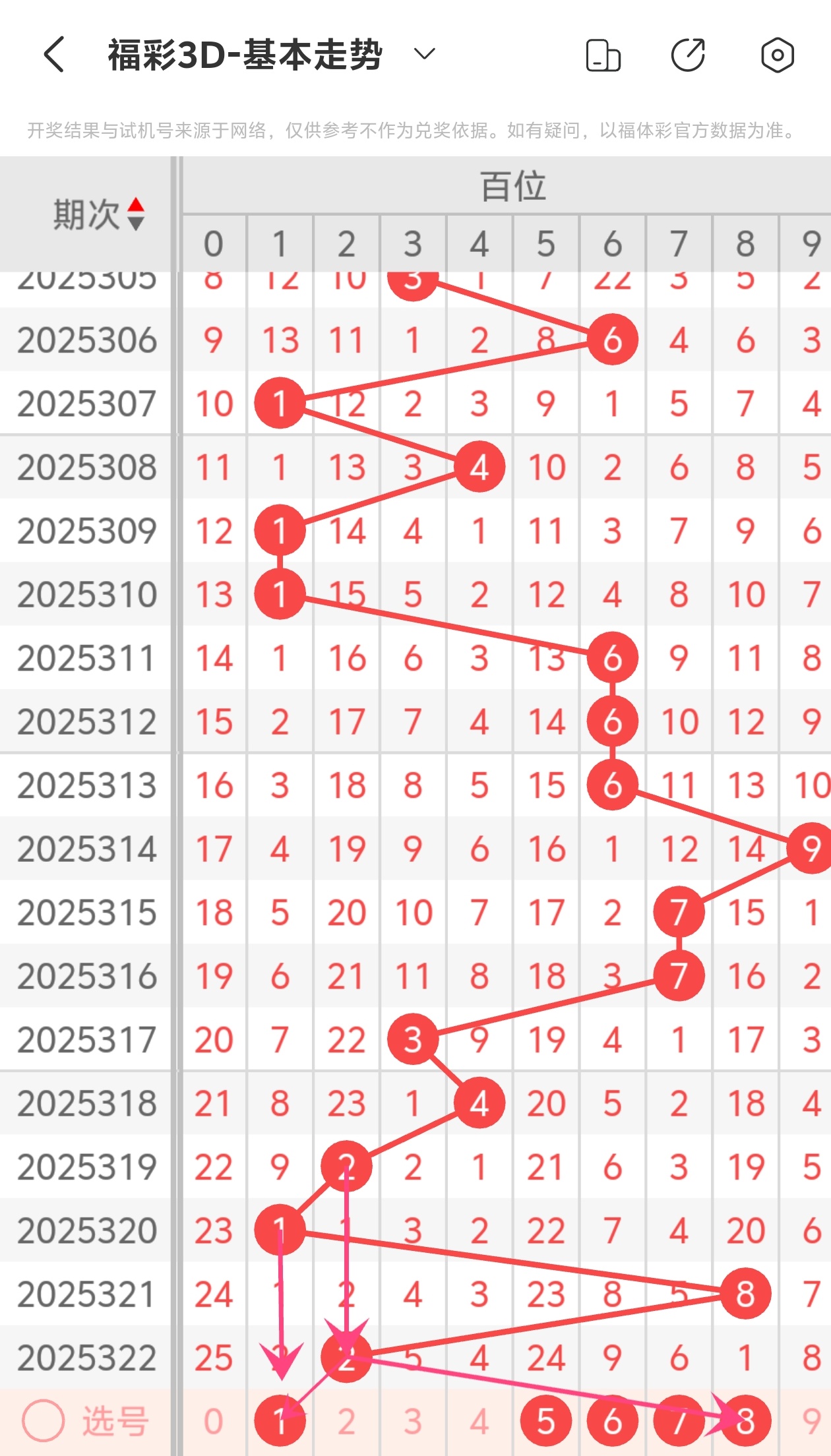 上期百位开出2,本区与上期的跨度为6,本期我们可以从上面走势图中看出选号的思路,1为分边走势跨度为一,8为隔期回补走势跨度为六,综合以上分析,本期百位推荐:15678