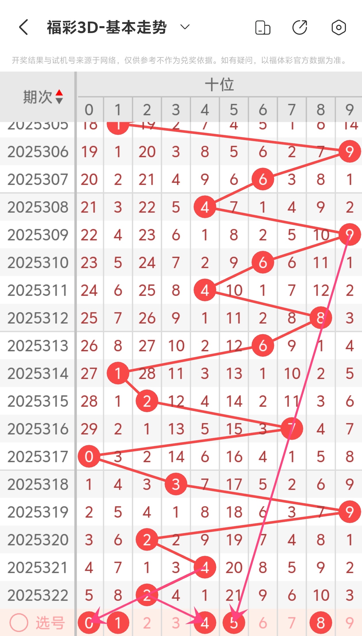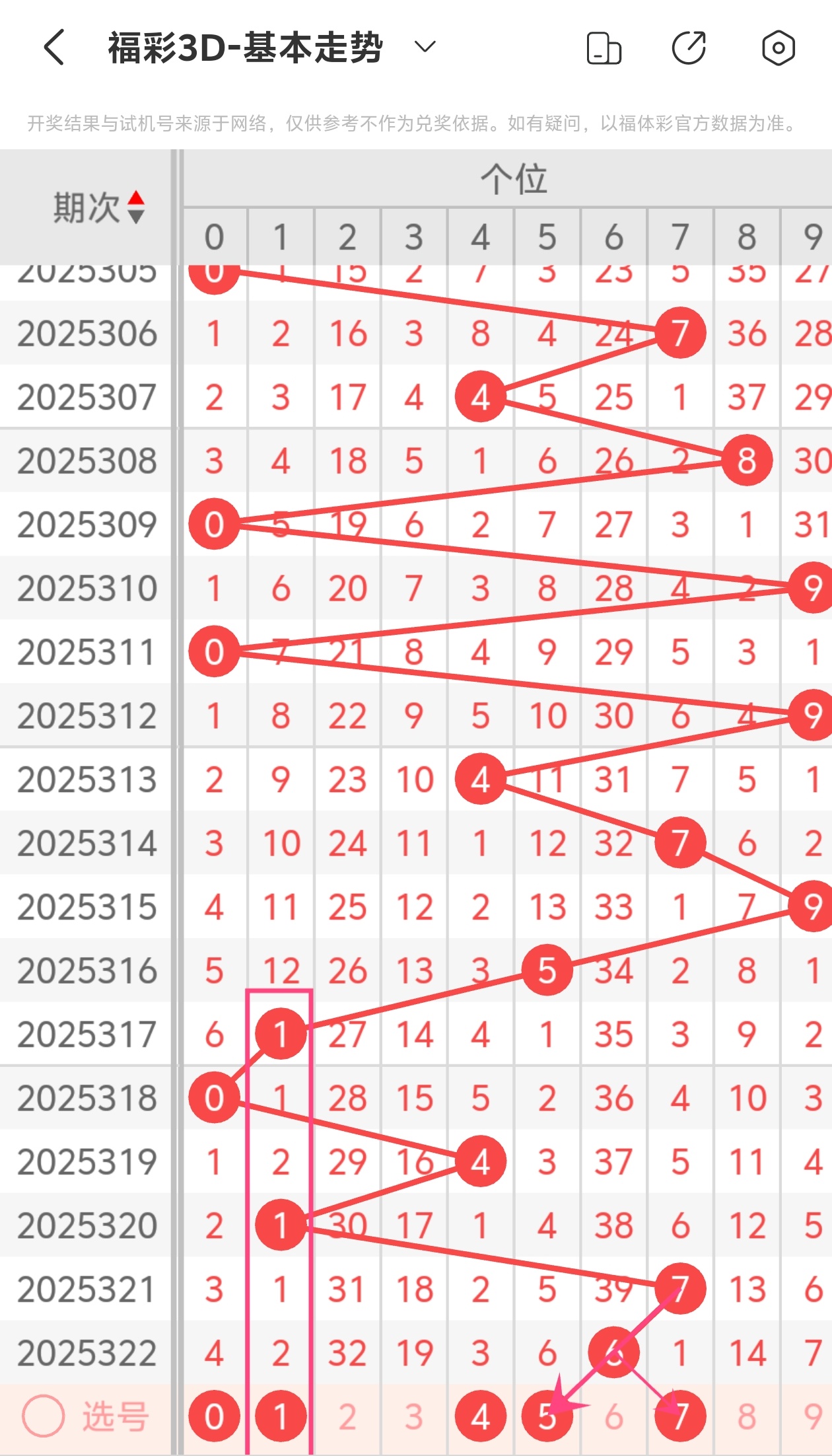 上期个位开出6,本区与上期的跨度为1,本期我们可以从上面走势图中看出选号的思路,1为对称形态,5为斜连走势跨度为一,7为隔期回补走势跨度为一,综合以上分析,本期个位推荐:01457
