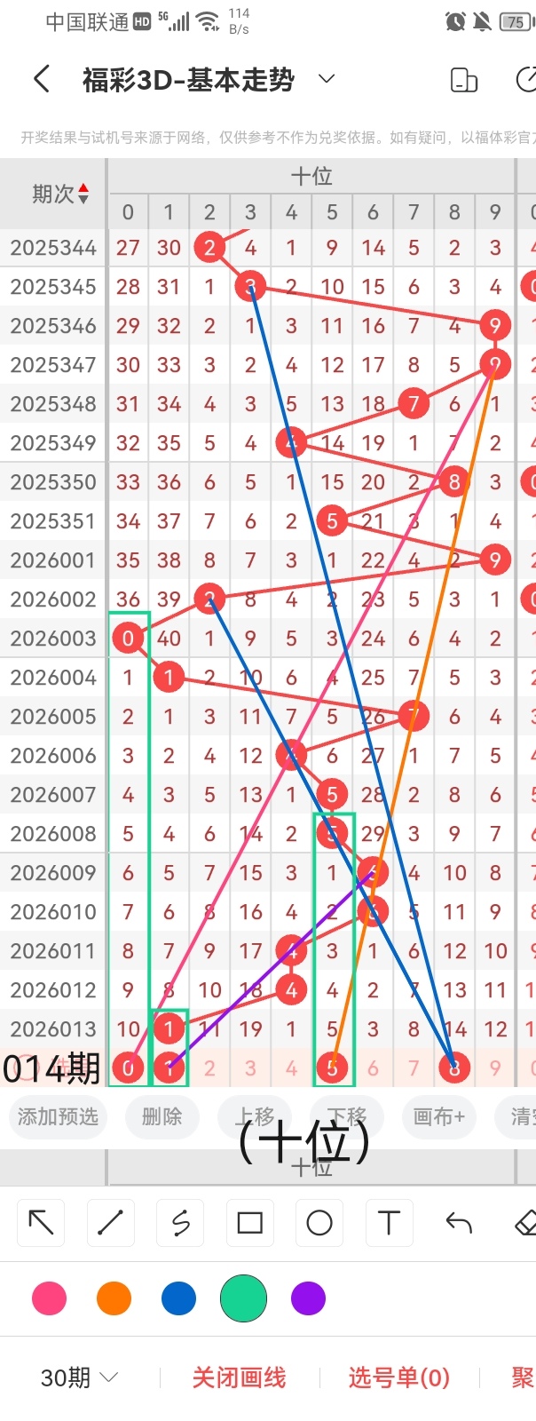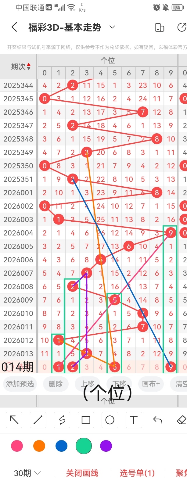 首先,为了感谢各位老板对小梁的关注和打赏,小梁特别提供一个杀个位的小技巧,同尾杀号法,准确率相还可以,但是要记住任何杀号都不能保证百分百准确的哦。小梁根据同尾杀号法,得知本期杀个位4。其次,小梁依照上图中的画线思路可以得出,号码1与前几期开出的号码呈斜三连的走位且呈隔期回补的走势,跨度为2;号码2与前几期开出的号码呈斜连前后相互平行的走势且呈隔五期回补的走位,跨度1;号码5与前几期开出的号码呈隔四期回补的走位且呈两条斜三连的走势,跨度是2;号码9与前几期开出的号码呈斜三连的走势且呈隔九期回补的走位,跨度6。综上所述,小梁根据上图中画线思路分析,推荐个位的号码为:1、2、5、9。