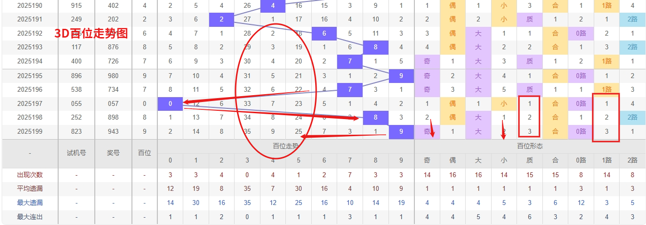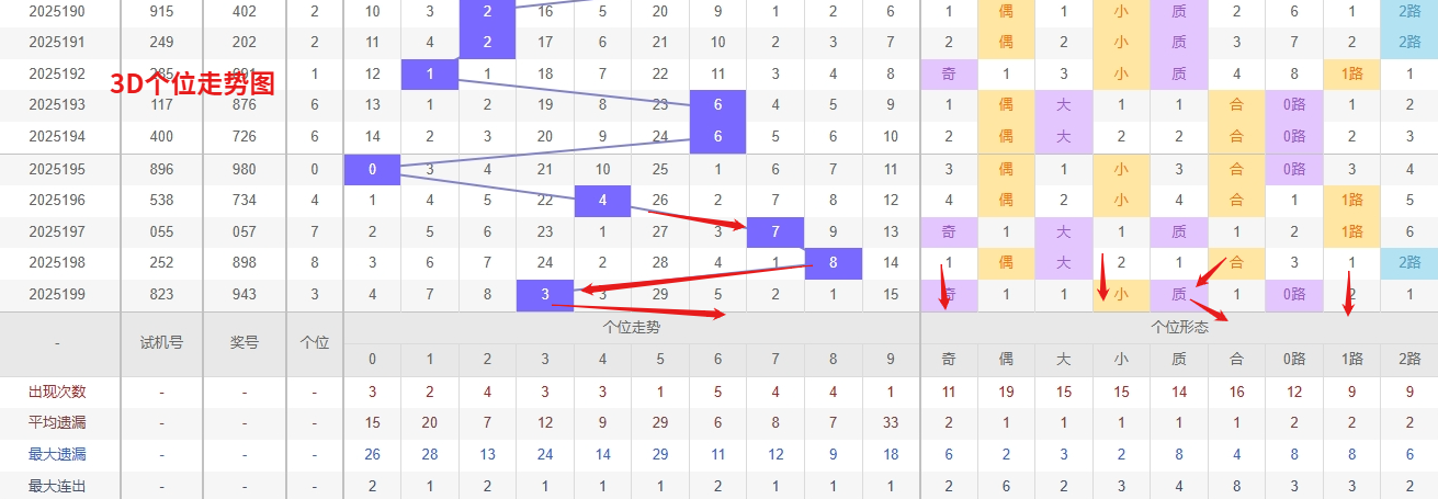 福彩3D个位分析:第2025199期个位开出号码3属于小奇数前端,从以上个位走势图中可以看出近100期的大小比约为53:47奇偶比约为54:46大小奇偶数据上有点差异有需求但不是太明显,不太好看这时就要借助连线走势和遗漏数据来帮助我们缩水号码。上期个位落号“3”小奇数0路号码球,号码开出了5振幅,连续多期的小振必被大振幅取代幅符合我们的预期,那么本期我们在个位考虑振幅走势走前依然要转变思路考虑大振幅,具体考虑(1-6)个振幅是我们主要的方向,那么在对个位落号情况进行系统的分析时我们可以明显的看到个位号码走势呈现大范围震荡,尤其是在号码的落位特点上表现的尤为突出,那么本期我们在个位分析时就要注意号码的风险,避免出现踏空。近期排列三个位走势冷热分化明显,冷号方面需重点关注"5"和"9"的持续低温——"5"已遗漏28期,超过其历史平均遗漏值(约20期),回补需求强烈;"9"同样遗漏达22期,逼近理论反弹节点(25期左右),两者均进入技术性追号窗口。热号"6"表现尤为抢眼,近10期强势开出5次,形成斜连脉冲走势,短期热度仍在延续。采取"冷热对冲"策略:主攻"9"的深度回补,辅守热号"6"的续热表现,因此福彩3D第2025200期个位看好05689。本文由一起彩钱是生命动力所著,请勿转载
