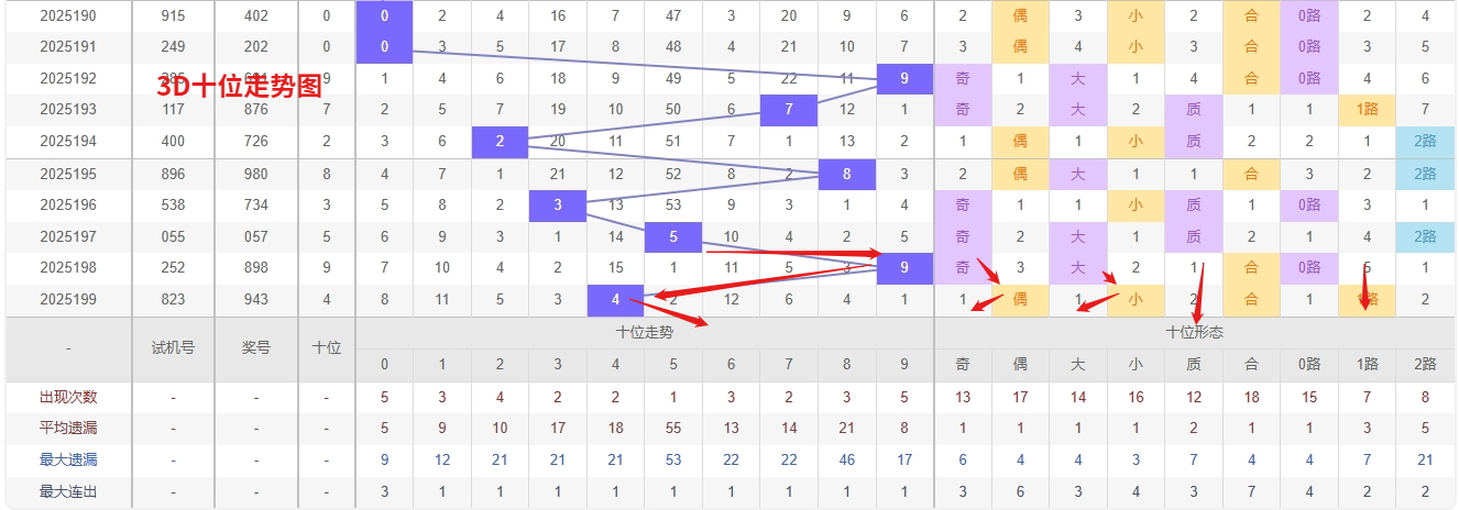 福彩3D十位分析:第2025199期十位开出号码4属小偶数号码前端。以历史100期数据为例十位奇偶比约为47比53,大小比约为54比46近期大小相差5点,根据求均衡的规律开出小数的概率比大数高一点。上期我们分析奇数经过连续回补后有走偶数的可能,开出奖号4小偶数符合我们的预期。近期3D十位走势呈现多态并存特征:"4"虽然刚刚解冻开出,但此前经历了长达21期的深度遗漏,远超过其历史平均遗漏周期,这种"压抑性反弹"往往具有持续性,需重点防范其连开可能;冷号"5"已平均遗漏55期,反弹临界点(25期左右),值得开始布局埋伏。热号方面,"0"近期表现抢眼,10期内开出4次且呈现"隔期热出"的节奏规律,短期热度尚未消退。采取"追连防冷"的混合策略:以刚回补的"4"为主攻方向,搭配热号"0"的节奏性出号,同时开始对"5"进行渐进式建仓,所以福彩3D第2025200期十位推荐03456。本文由一起彩钱是生命动力所著,请勿转载