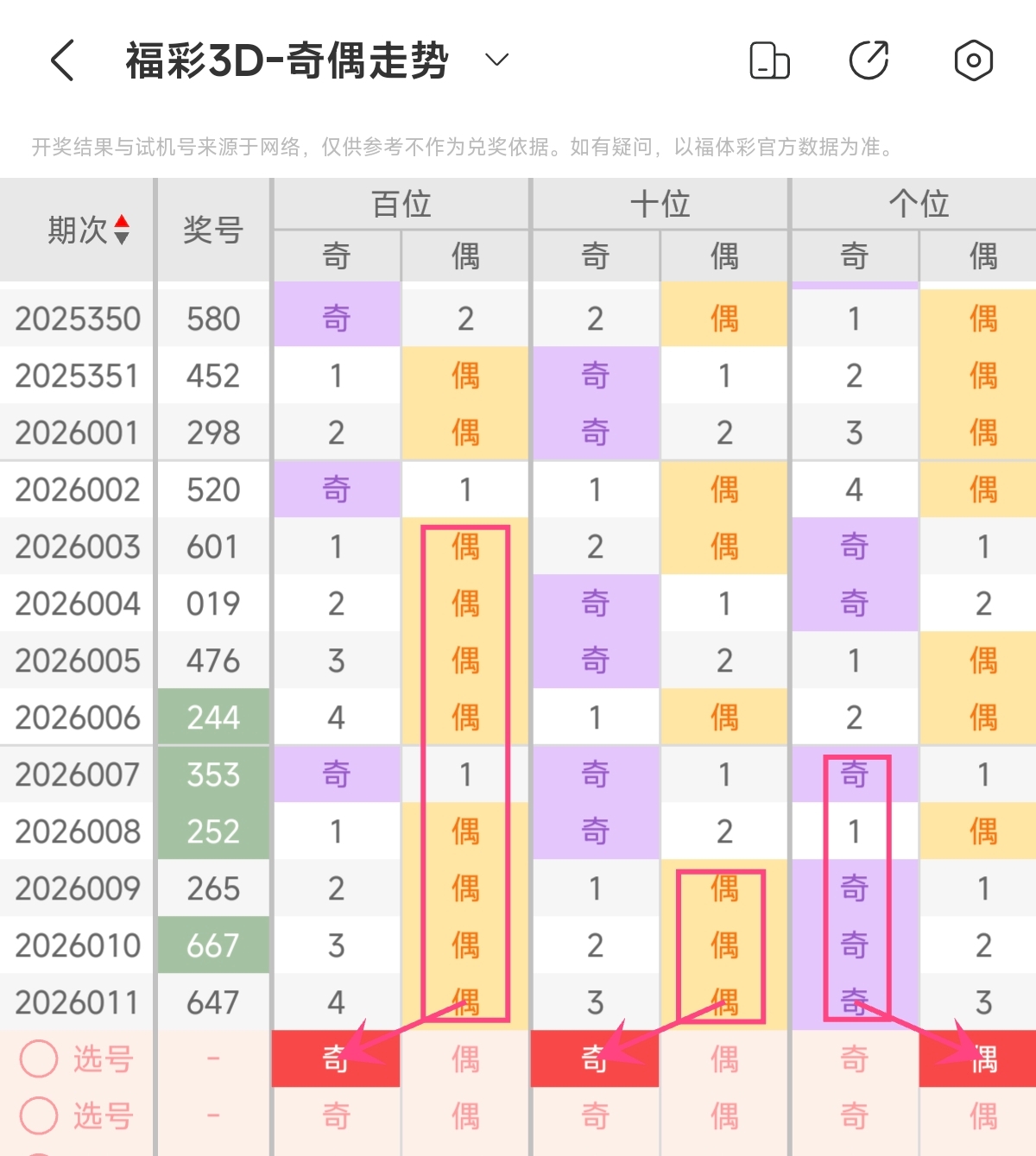 上期奇偶形态为偶偶奇,奇偶比为1:2,偶数占优。根据近期奇偶形态变化来看,近期奇偶比开出多为偶数号码占优形态,奇偶比1:2已经连续4期开出,预计本期奇偶比会有所变化,本期需注意奇数号码的反弹,预计本期奇偶形态会回补奇数号码占优组合。预计本期可关注奇偶比2:1,奇数占优组合 。本期奇偶形态可重点关注:奇奇偶。