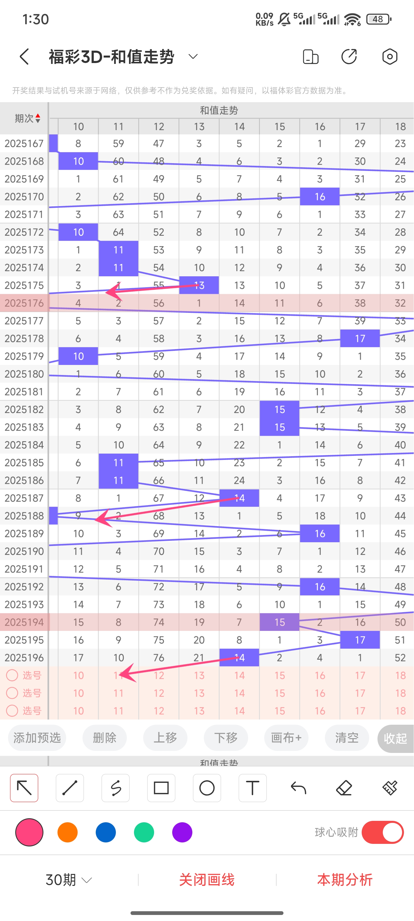上期和值是14,往前一期和值是17。和值向左偏移,偏移振幅为3,小幅度向左移动。因为和值14也还是处于比较中间的位置,和值的上升空间和下降空间都差不多,本期趋势也是不太明显。但如果以15和值为中间的话,大于15为大和值,小于等于15为小和值。近30期内开出大和值的次数为10次,开出小和值的次数是20。可以比较明显看出比较倾向开小和值的,那么目前趋势就比较可能是继续往左下降了。